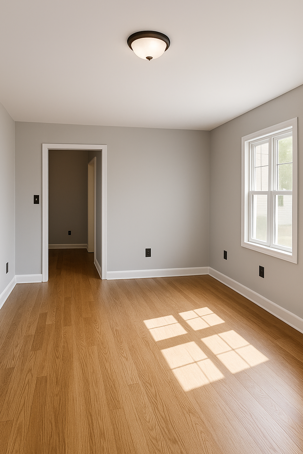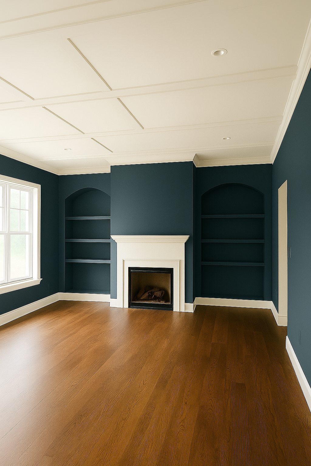 Our process begins with spraying the ceilings in a flat sheen to establish even coverage and a clean foundation. Once ceilings are complete, the trim work is professionally sprayed to create a sharp, uniform finish. The walls are painted last as they require a careful cut in with a brush to ensure crisp edges before being rolled for consistent, flawless coverage.